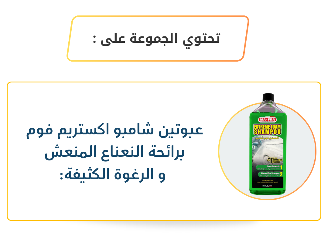 - اكستريم فوم شامبو هو حليفك لمرحلة الغسيل التحضيري والغسيل أيضا, بفضل تركيبته المطورة، يضمن لك في منتج واحد نتيجة وفاعلية الملينات المستخدمة في منتجات الغسيل التحضيري باستخدام مسدس الرغوة وشامبو مثالي للاستخدام في سطل الغسيل والقفاز للغسيل اليدوي.