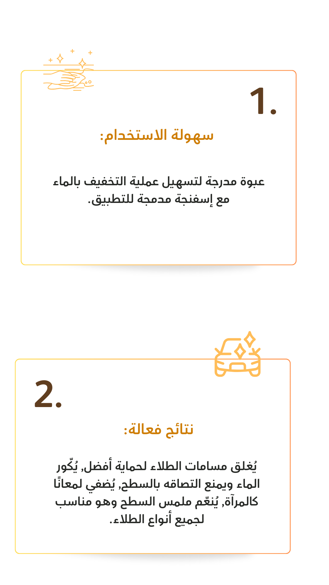 - ينصح بغسيل السيارة قطعة قطعة و شطفها بعد غسيل القطعة بالماء للحصول على افضل نتائج
